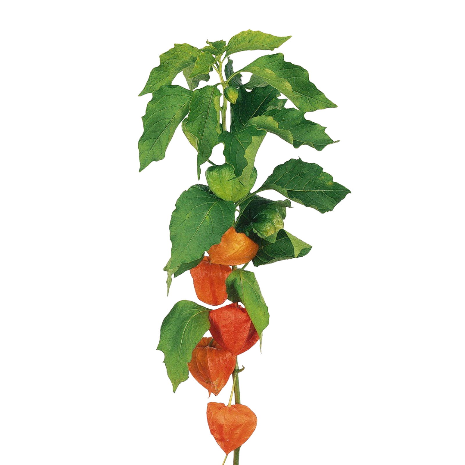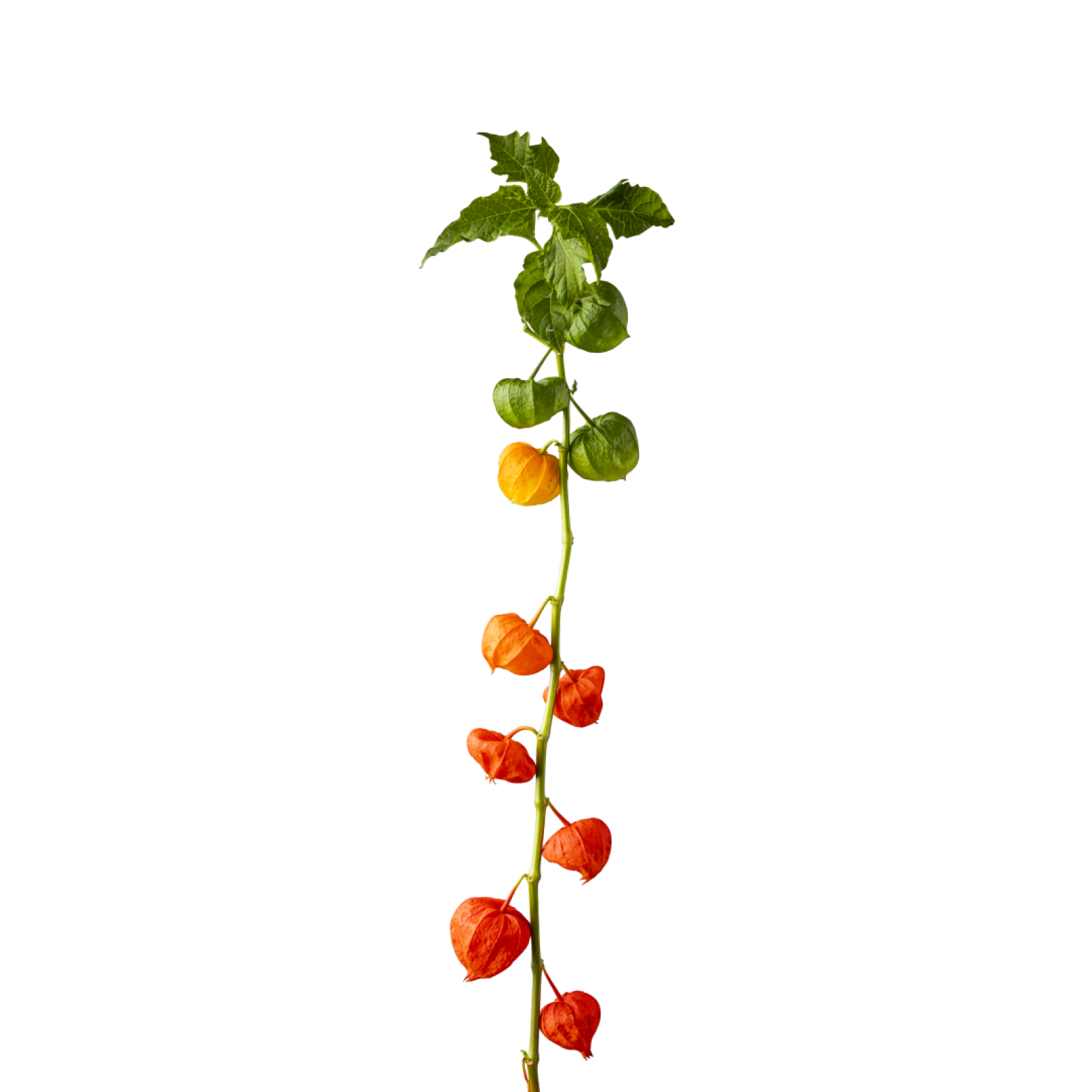 Physalis har en frisk grøn stængel med lanterner på i farven orange.