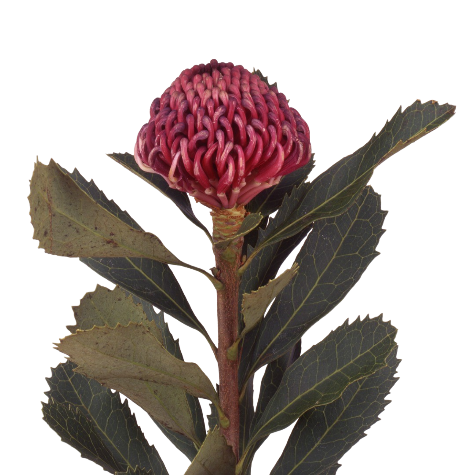 - Stilfulde applikationerTelopea speciosissima waratah har en unik form, og blomsterhovedet er omgivet af lange, spidse blade.