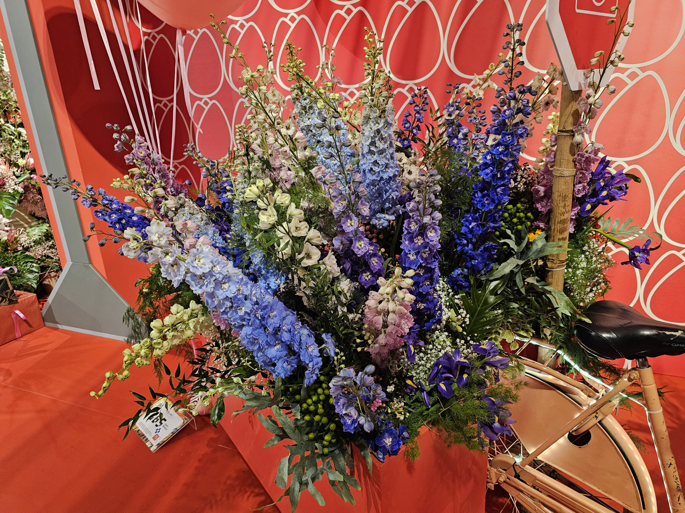 Følgende blomster kan beundres i Oranje Nassau-pavillonen på Keukenhof indtil onsdag: forskellige sorter af Hypericum, Veronica Smart Wave, Eupatorium Lucky Pink, enkelt- og dobbeltblomstrede Delphinium, Gypsophila 'Polar Bear', Iris Blue Magic, Matricaria (kamille), Astrantia Billion Stars, Scabiosa fr Vanilla Scoop, Helleborus Magnific Bells og fire farver af Phlox. Alt dette suppleres af dekorativt grønt som Euonymus japonicus 'White Spire', Monster Leaf, Philodendron Xanadu, Cyrtomium falcatum og forskellige aspargesarter.