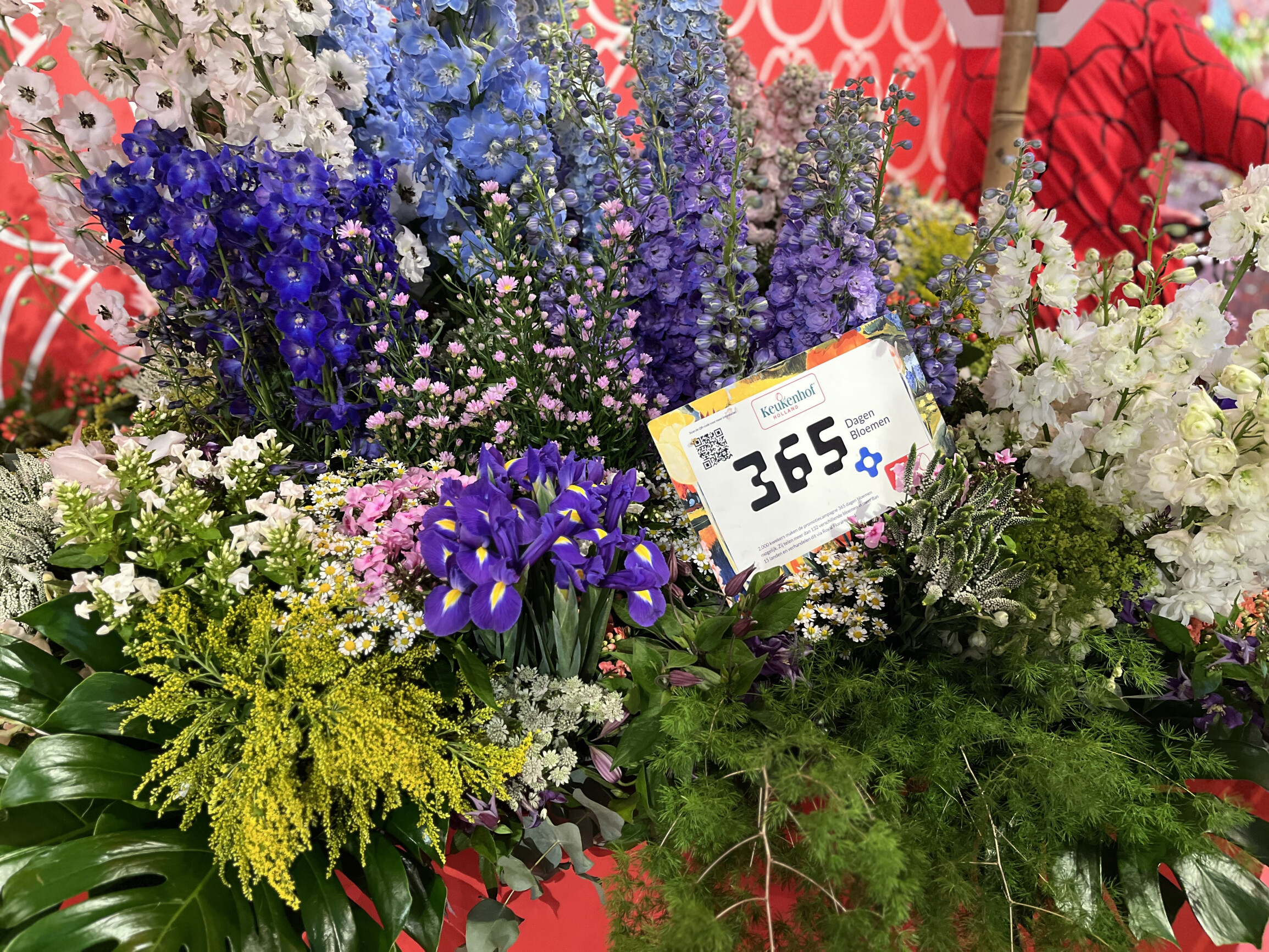Følgende blomster er udstillet i Oranje Nassau-pavillonen på Keukenhof indtil onsdag: Aster 'Claudia' (pink), Kalanchoe, Iris, Hypericum Coco Bamboo, Coco Rio og Coco Tango, Mentha Fresh Start, Solidago mini Gold, Veronica Smart Caya Spray og Smart Wave, fire farver Phlox, Matricaria (Kamille), Astrantia Billion Stars, Clematis (Integrifolia Group) AMAZING ROME, Delphinium Andes White, Leucanthemum vulgaris "Rheinblick" (margueritter), Alchemilla M Robustica, Hesperis White Dream og både dobbelt- og enkeltblomstrede Delphinium. Alt dette suppleres af dekorativt grønt som Euonymus japonicus 'White Spire', Monster Leaf, Philodendron Xanadu, Cyrtomium falcatum og forskellige aspargesarter.